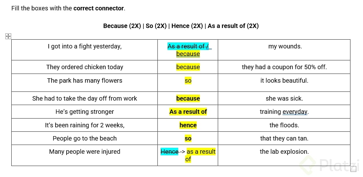 Practicar con estos dos conectores puede ser muy revelador. Por ejemplo, si decimos: I am healthy because I eat my vegetables, el efecto es estar sano, y la causa es comer vegetales. En cambio, si reordenamos, podemos decir: I eat my vegetables so I am healthy.