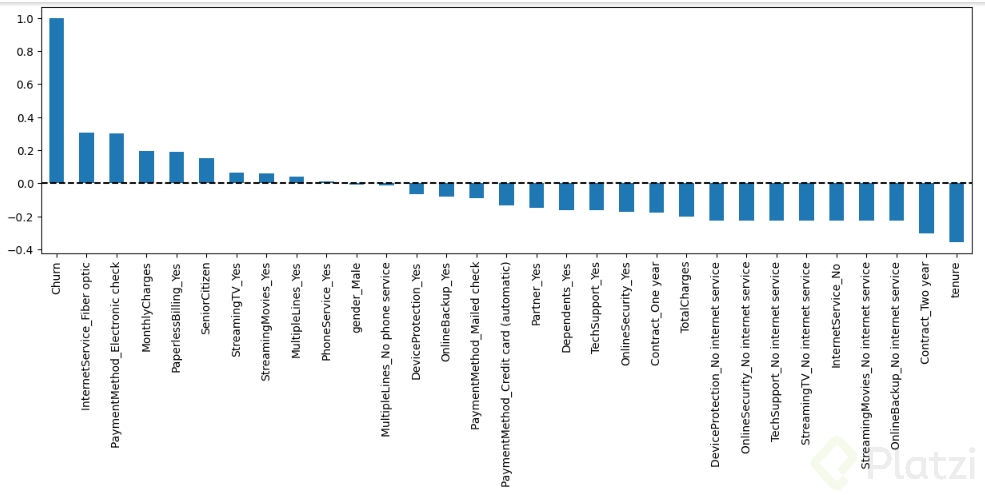 Además, las características como cuánto tiempo lleva un cliente con el contrato o si tiene un contrato a dos años, están inversamente correlacionadas. Esto indica que mientras más tiempo y mayor dureza tenga el contrato, menor es la probabilidad de churn.