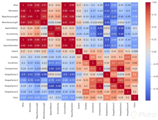 A partir del análisis, se decidió eliminar las variables convex_area y equidiameter debido a su alta correlación con otras variables como area, perimeter, length, y width, que podrían conducir a un sobreajuste del modelo.