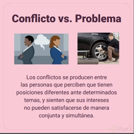 Mientras que los problemas tienen soluciones concretas y surgen ante circunstancias específicas, como cambiar una rueda pinchada de tu auto, los conflictos trascienden a eso. Involucran a más de dos personas que ven el mismo escenario de manera diferente, están en desacuerdo y necesitan manejar esas diferencias. Los problemas son situaciones concretas con respuestas claras, y el conflicto va más allá del simple hecho físico, involucrando perspectivas personales y subjetividades.