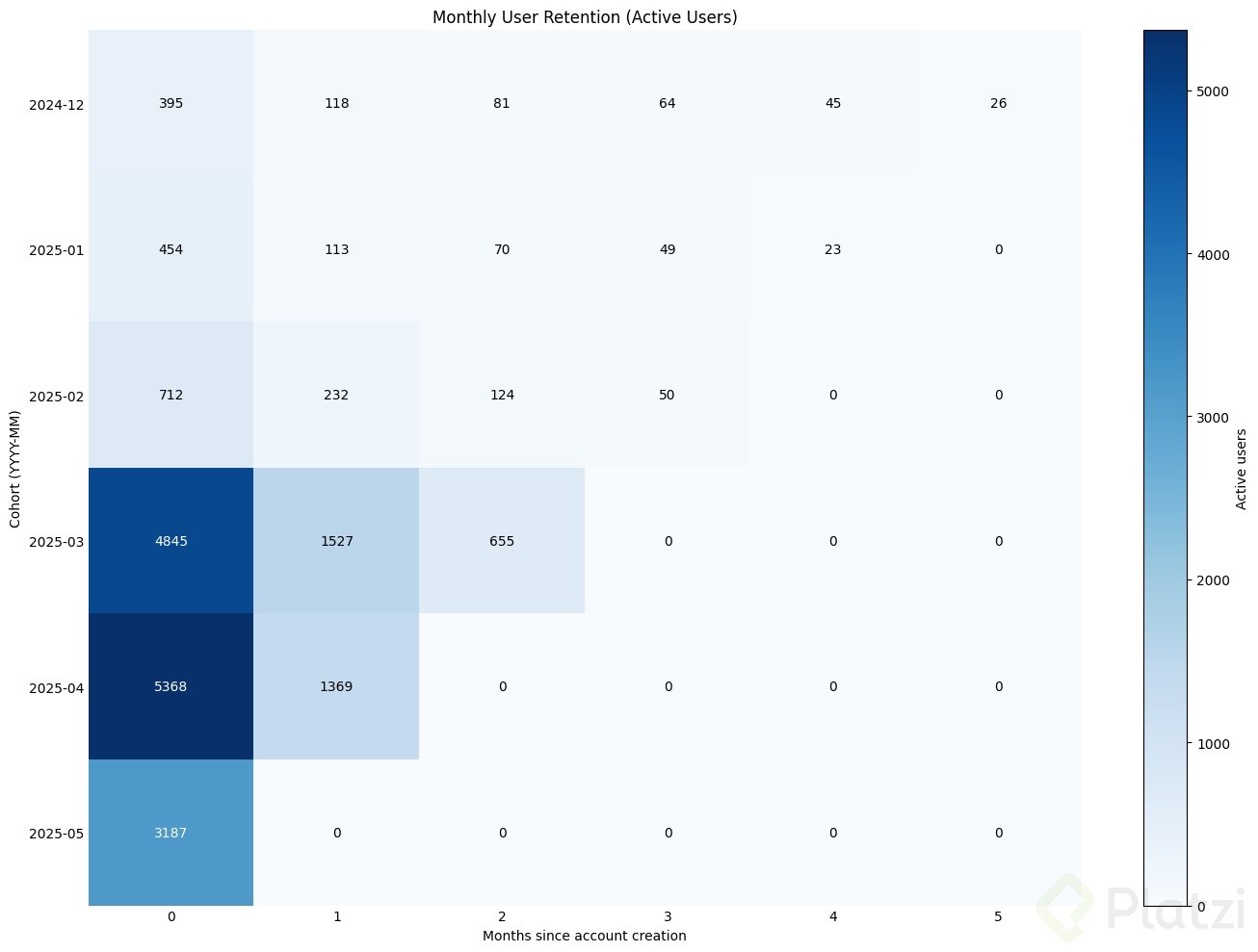 - Propósito de análisis por cohortes: Identificar tendencias de retención y detectar mejoras o deterioros en el comportamiento de un mismo grupo de clientes.