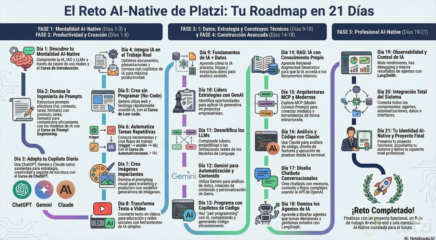 El reto AI-Native de Platzi no es un curso ni una clase suelta. Es una experiencia de tres semanas para aprender, practicar y construir tu propio proyecto con IA aplicada según tu profesión.