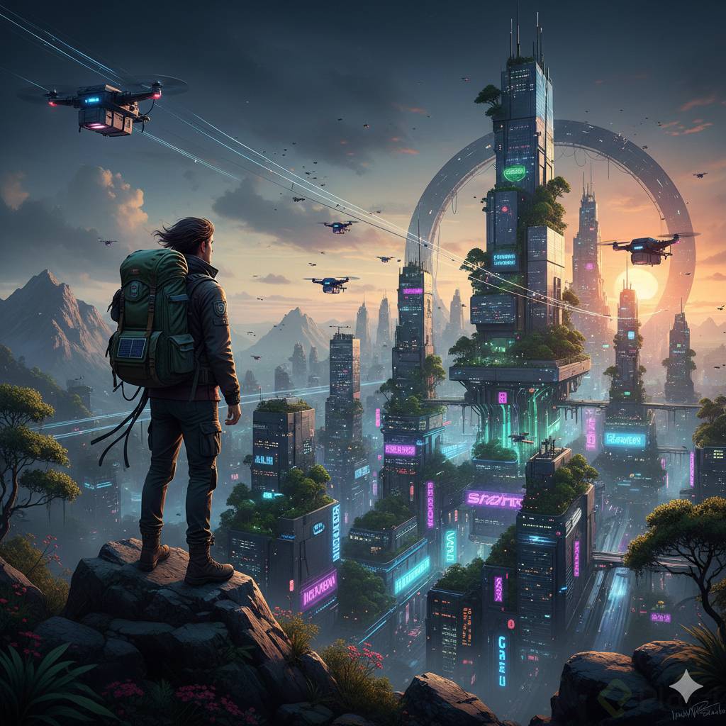 - Descripción: “viajero con mochila mirando una ciudad futurista a lo lejos desde el filo de una montaña.”