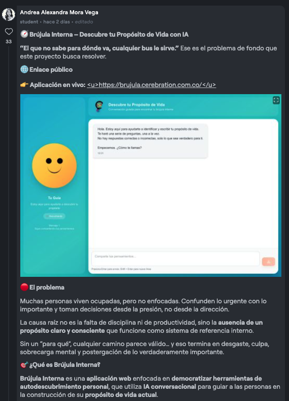 4.1. El proyecto debe ser una aplicación creada aplicando los fundamentos de ingeniería y herramientas de IA aprendidas. 4.2. Forma de entrega: El proyecto debe publicarse exclusivamente en la sección de comentarios del curso oficial del reto. 4.3. Requisitos de la publicación: