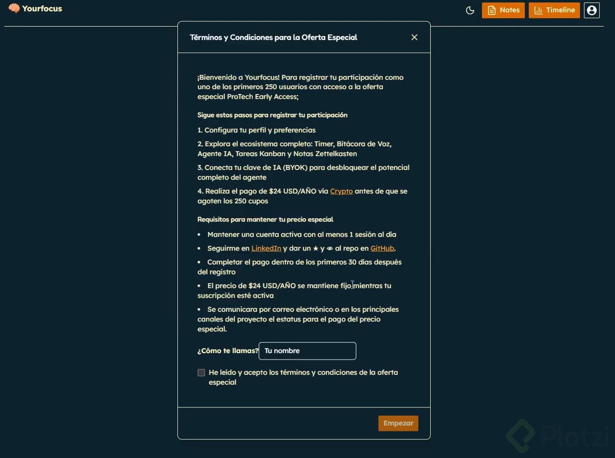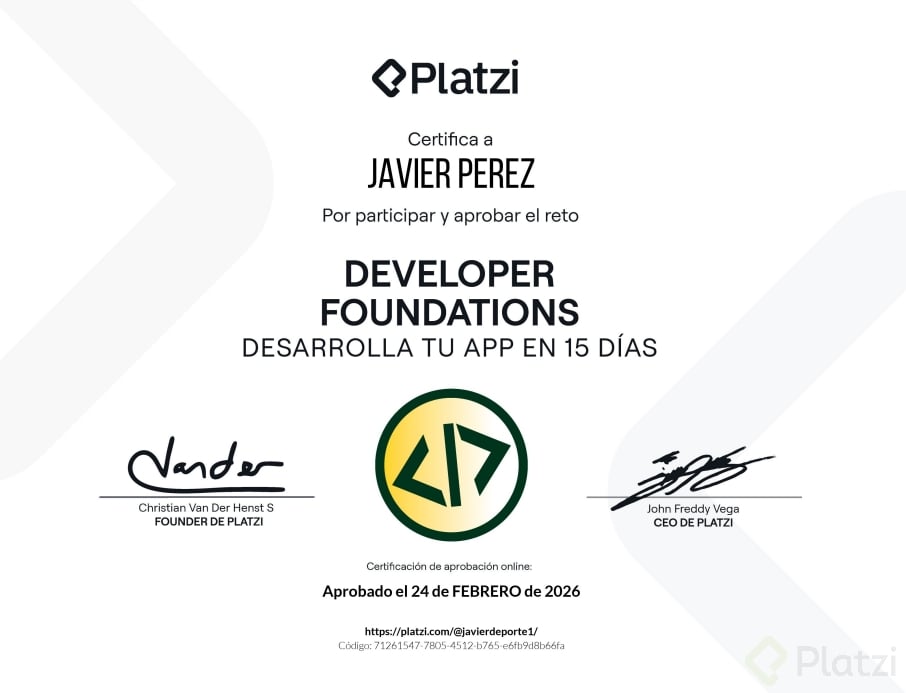 Platzi invita a su comunidad a participar en el Reto Developer Foundations, un programa intensivo diseñado para desarrollar bases sólidas de ingeniería de software utilizando Inteligencia Artificial como acelerador. Al participar, los estudiantes aceptan los siguientes términos: