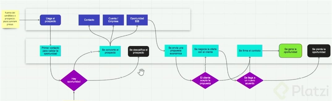 El candidato es la persona o empresa interesada en los productos o servicios que ofrece tu compañía. El primer paso en el flujo de ventas es que el candidato llegue a través de distintos canales, por ejemplo, una página web específica como "Platzi.com/empresas". Tras recibir su información, se realiza un primer contacto para validar si realmente existe una oportunidad de negocio.