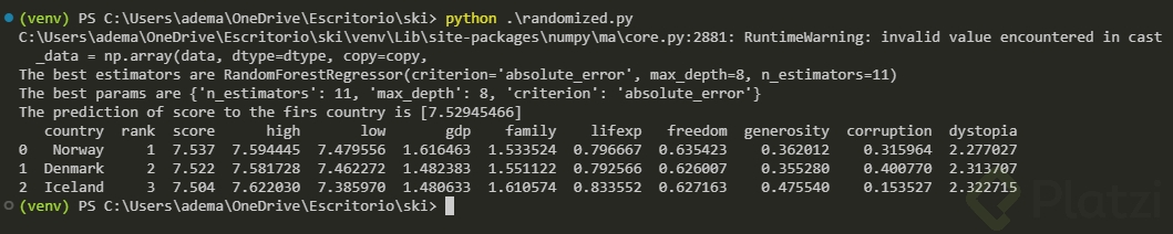 Entrena el modelo utilizando la configuración optimizada por RandomizedSearchCV. Es esencial imprimir el mejor estimador y los parámetros para revisar la calidad de los resultados.