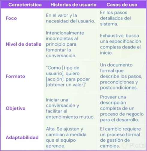 - Foco: historias de usuario buscan valor y necesidad; casos de uso describen pasos del sistema.