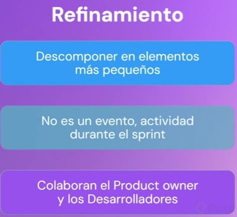 El refinamiento descompone los elementos del product backlog en partes más pequeñas, concisas y detalladas. No es un evento de Scrum, sino una actividad continua durante el sprint.