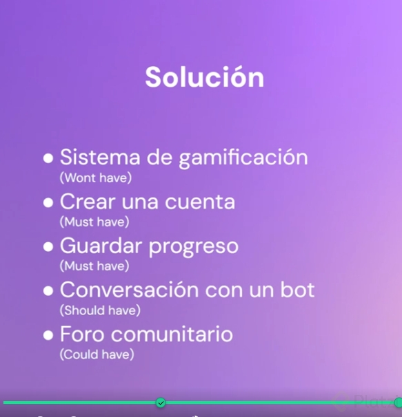 - *Must have*: guardar progreso. Permite ver el avance de aprendizaje.