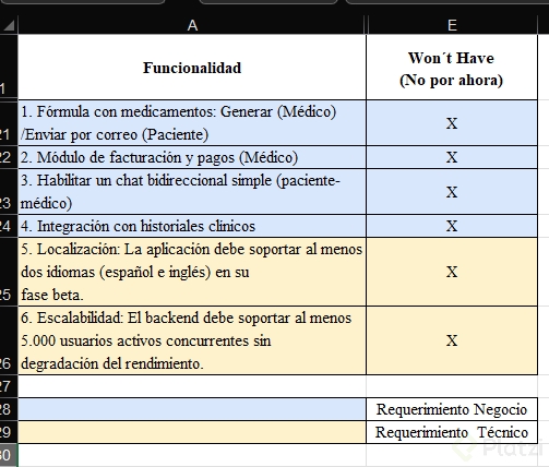 - *Won’t have*: sistema de gamificación. Se considera a futuro por restricciones de tiempo y presupuesto.