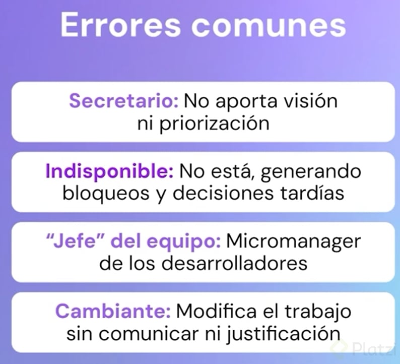 - Tratar al product owner como secretario: toma notas sin aportar visión ni prioridad.
