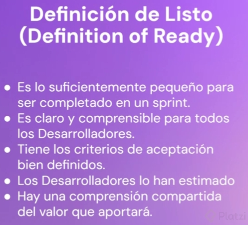 La definición de listo garantiza que cada elemento esté claro y refinado antes de entrar al sprint. Aunque no es un artefacto de Scrum, es una práctica que hace al equipo más eficiente al reducir ambigüedad y rework.