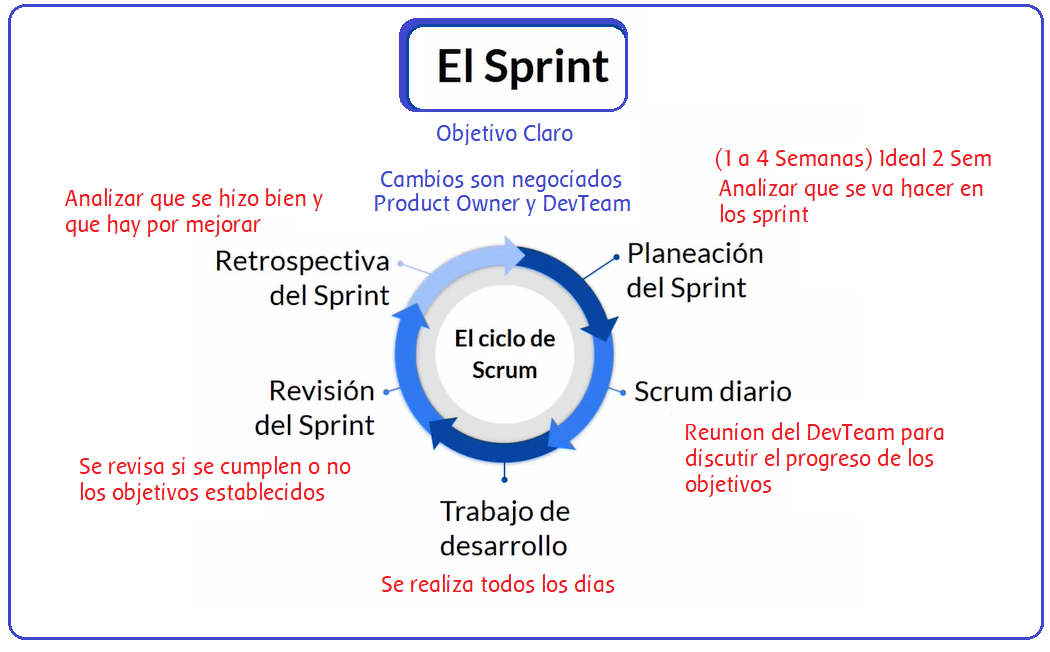 - Retrospectiva del Sprint. En esta sesión el equipo analiza qué tan bien lo ha hecho y qué puede mejorar. Las mejoras identificadas se aplicarán en el siguiente Sprint.