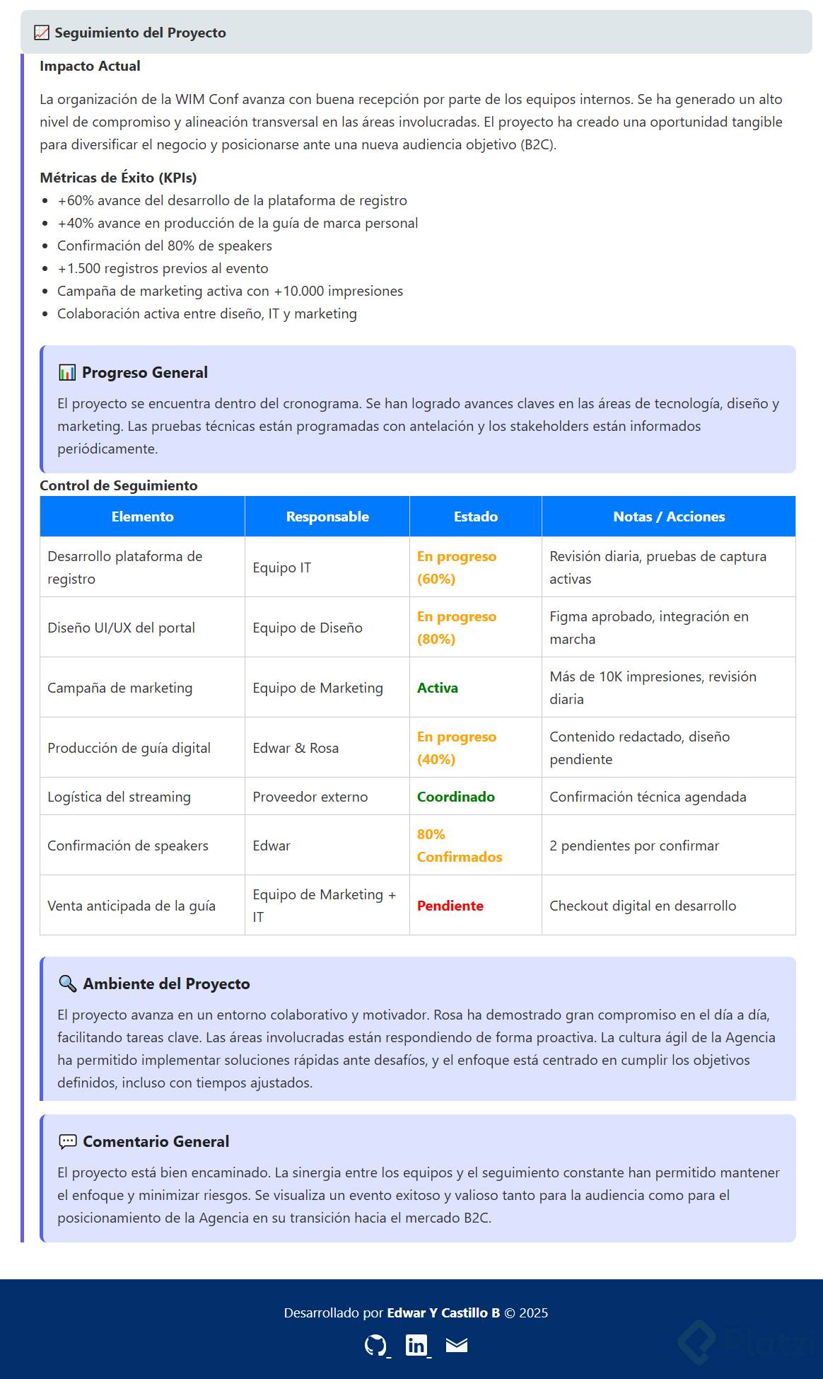 La planificación y seguimiento eficaz de un evento es crucial para el éxito de cualquier proyecto. Este proceso implica asegurarte de que tu equipo está cumpliendo con lo requerido y pactado con las partes interesadas. En este contenido, te guiaremos a través de los pasos esenciales para llevar a cabo un seguimiento efectivo, tomando como ejemplo un caso práctico de una conferencia de marketing para hombres y mujeres.