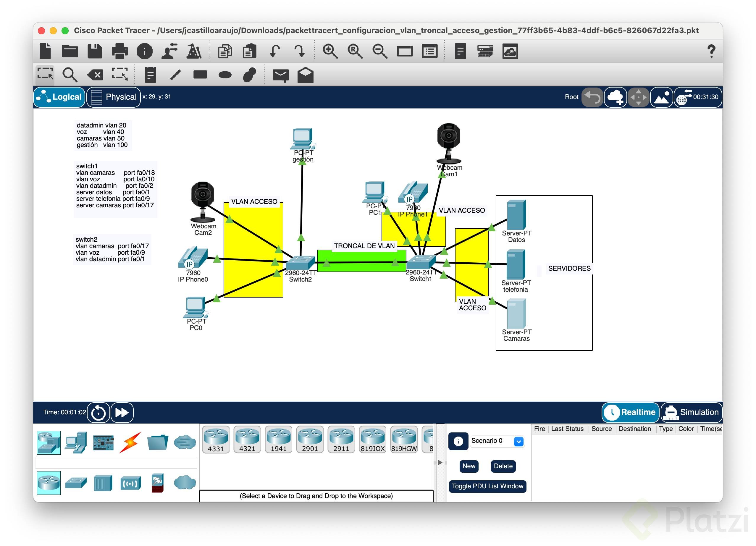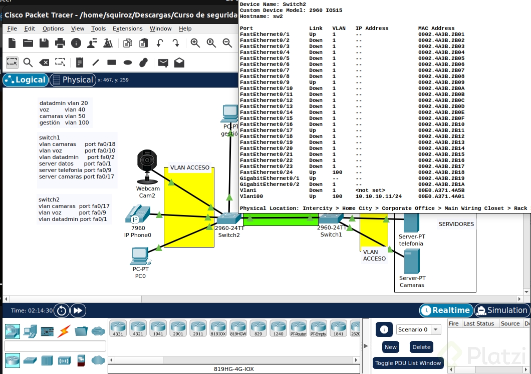Identificación del puerto terminal: Selecciona la interfaz del switch que conecta con el dispositivo terminal, como FastEthernet0/18 para una cámara.