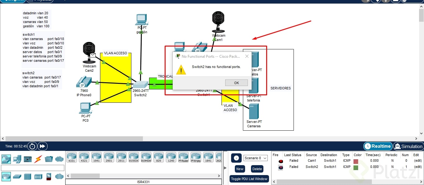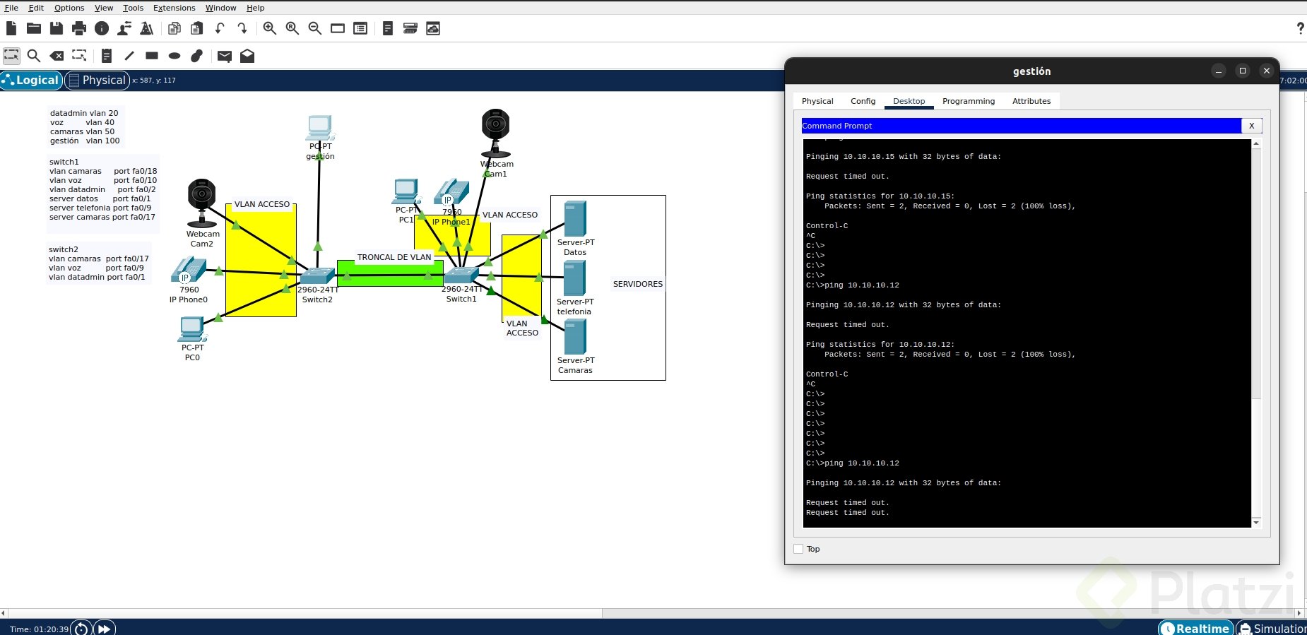 Asignación de VLANs: Defina cuáles VLANs serán transportadas por este troncal. Por ejemplo, use las VLAN 20 (voz), VLAN 40 (cámaras), VLAN 50 (datos) y VLAN 100 (gestión):