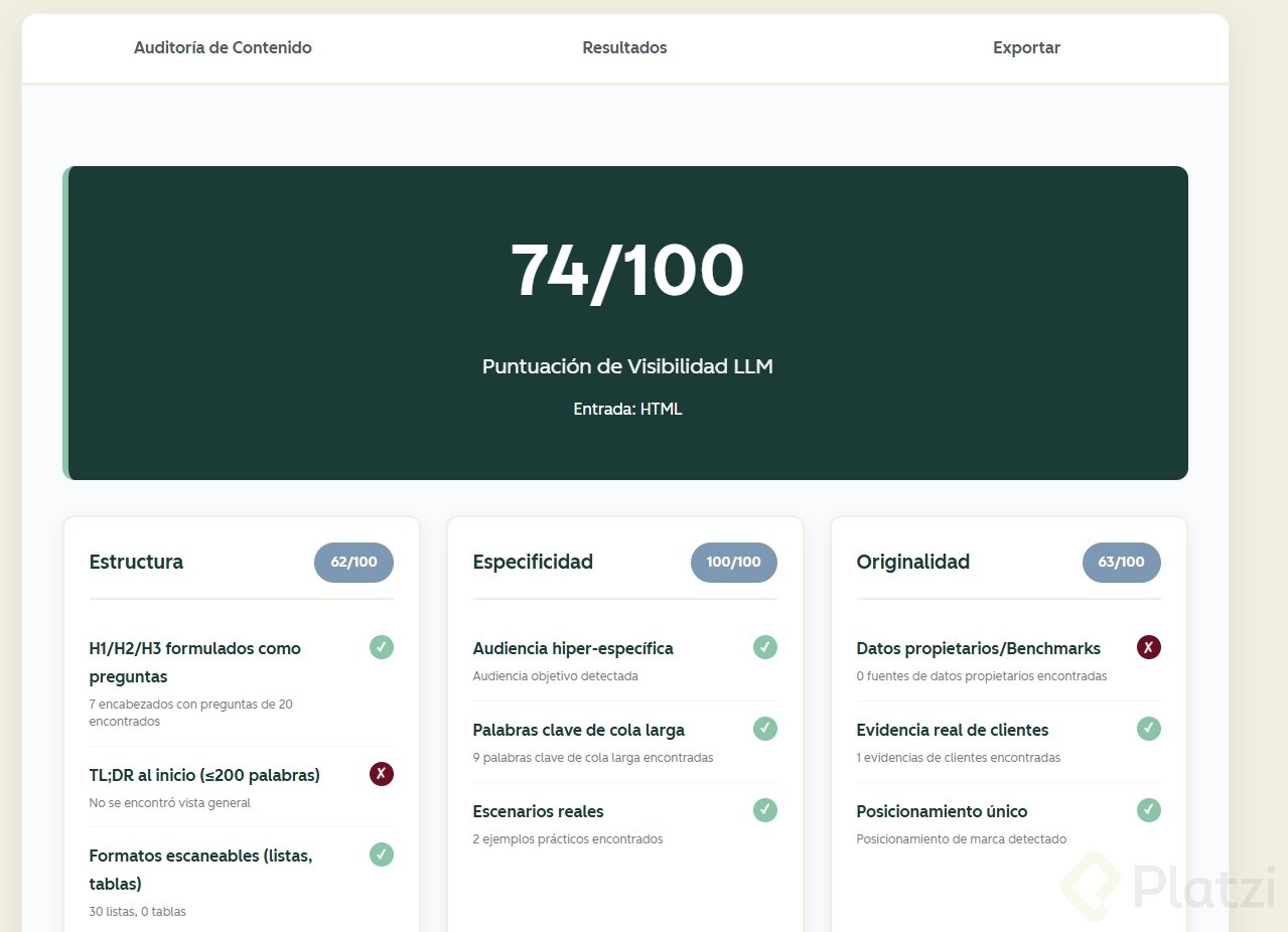 La auditoría revela brechas de estructura, especificidad y originalidad, y si tu página cumple reglas de AEO. Así priorizas correcciones y validas avances.