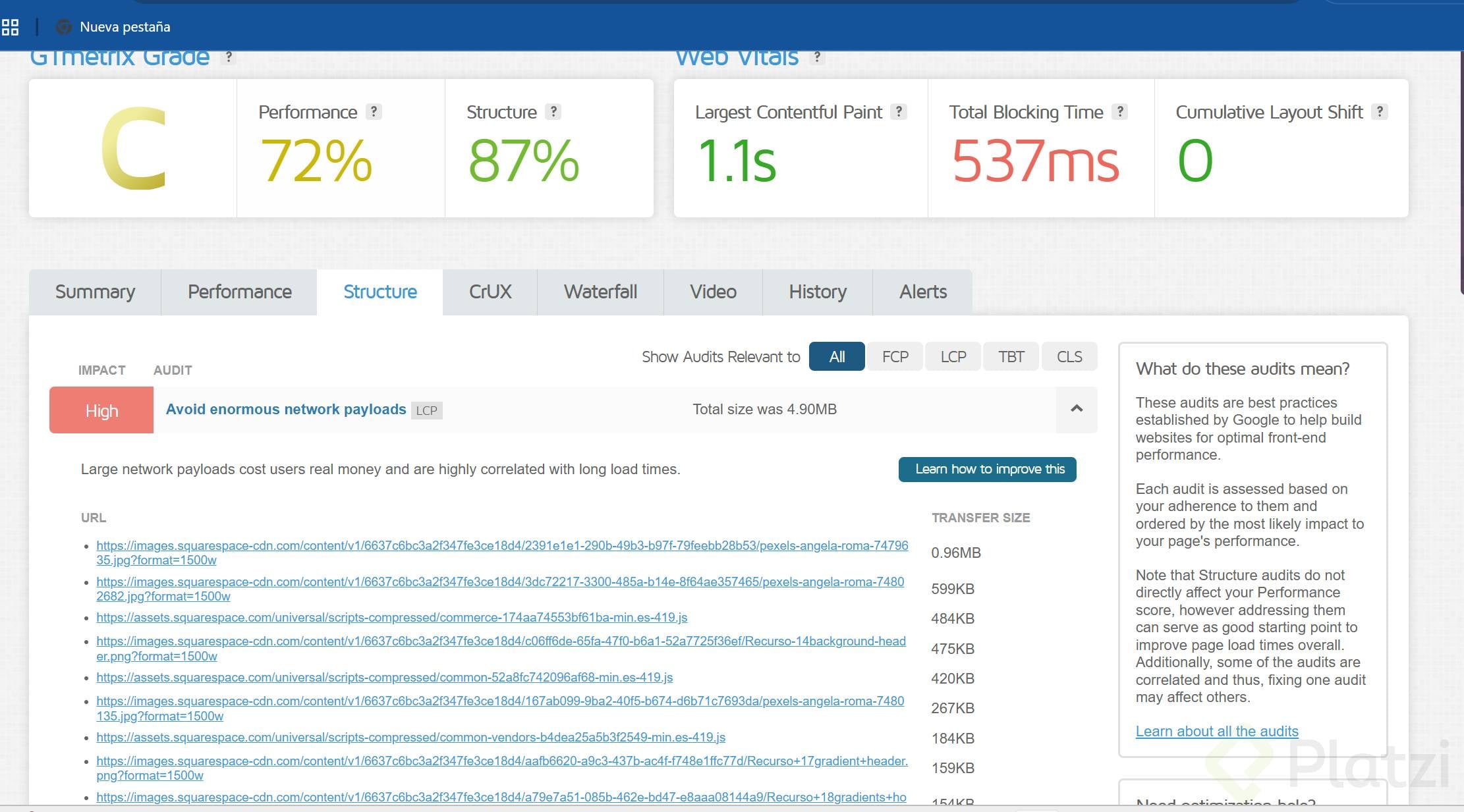 Dentro de la herramienta GTmetrix existe un factor llamado Leverage Browser Caching [1:30] que permite evaluar si el sitio está indicando correctamente los tiempos de almacenamiento en caché. Al desplegarlo, se pueden ver los errores específicos de cada archivo.