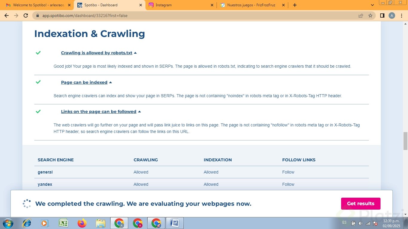 - Una vez finalizado el análisis, desplázate hacia abajo y busca la sección "Indexación y Rastreo" en el informe generado por Spotivo.