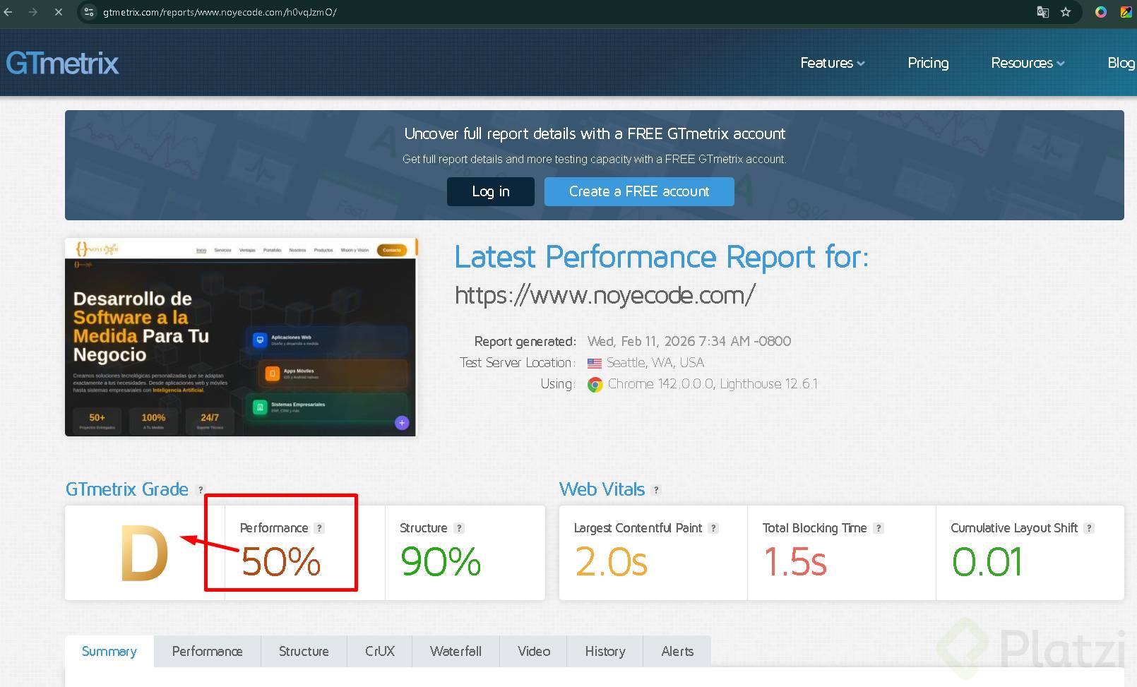 La velocidad de carga de tu sitio web también es crucial. Un sitio web más rápido brinda una mejor experiencia de usuario. Existe una herramienta gratuita llamada GTmetrix que te permitirá analizar la velocidad de carga de tu sitio web. ¿Cuál es el tiempo de carga ideal?