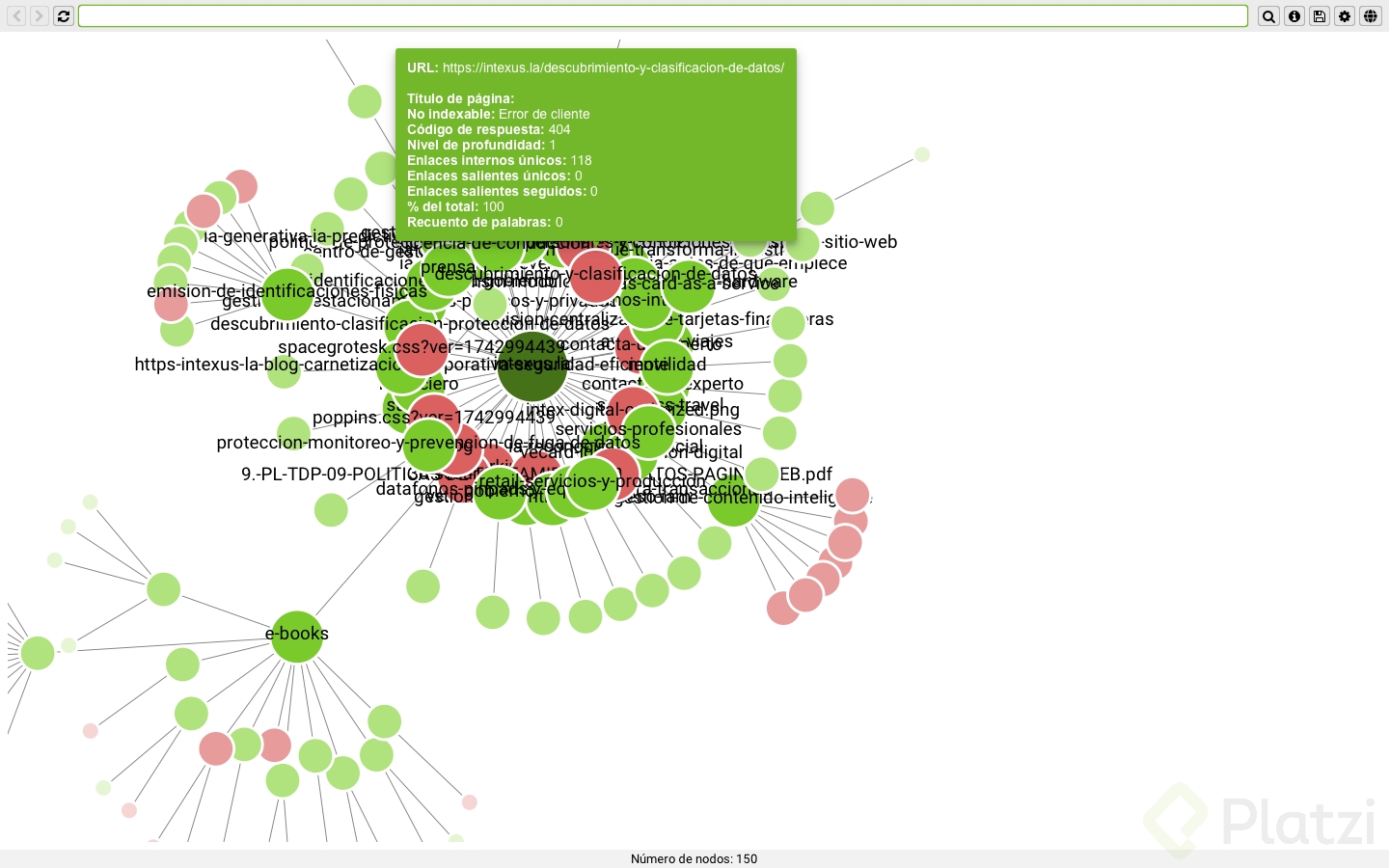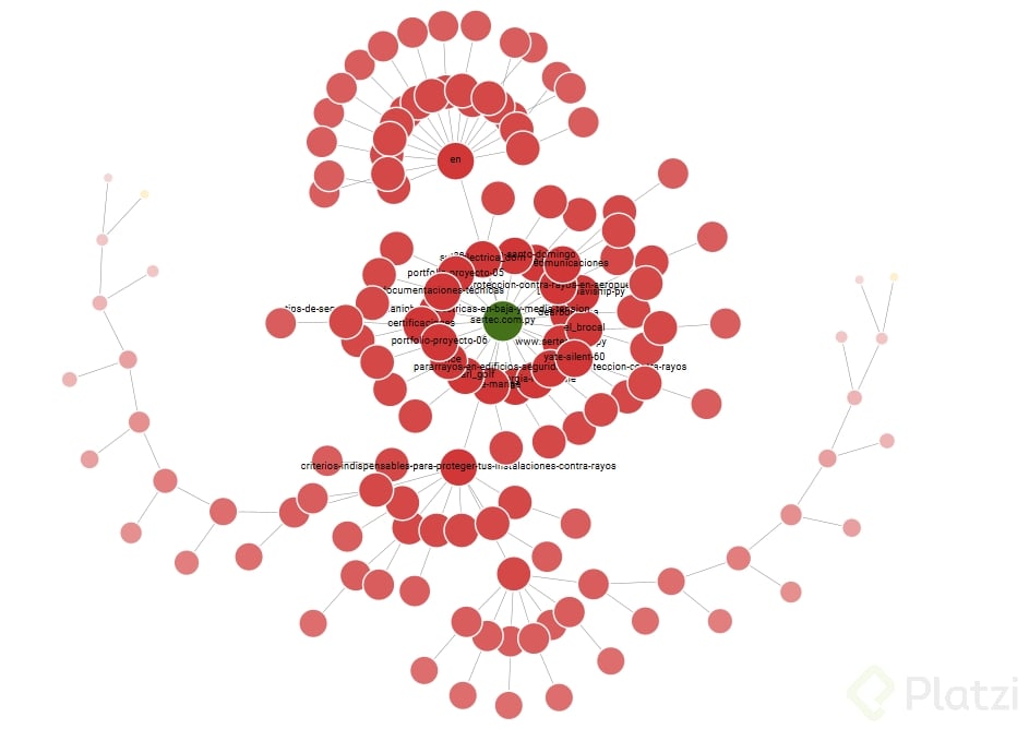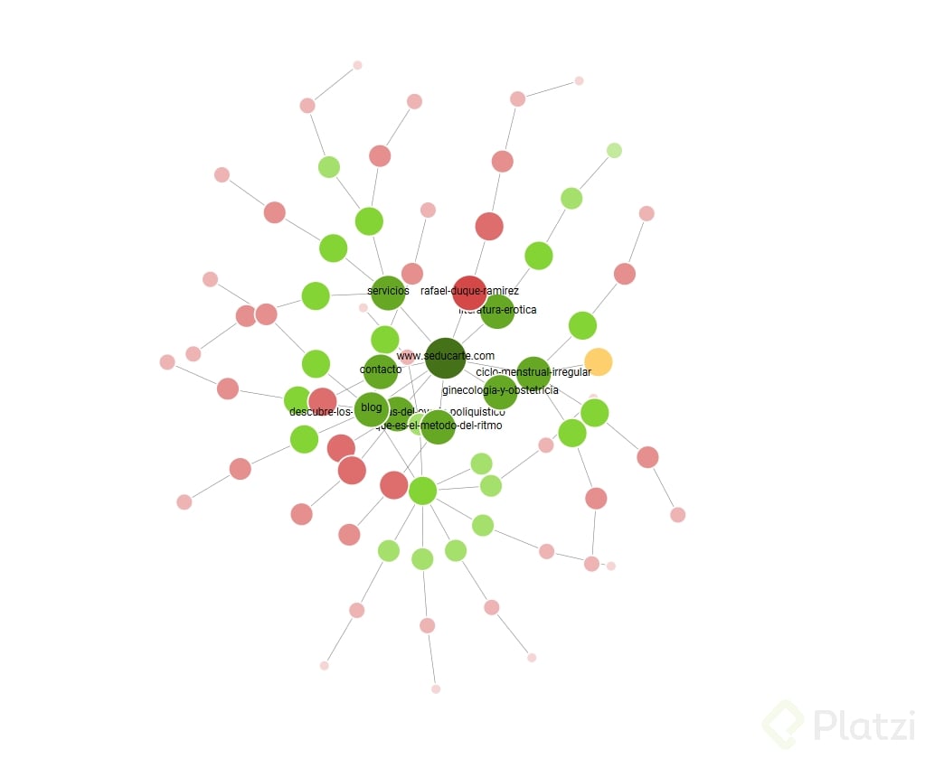 En el diagrama, la página de inicio se encuentra en el centro y muestra información como el título de la página, código de respuesta, H1, H2 y nivel de profundidad. El nivel de profundidad cero corresponde a la página de inicio, mientras que los niveles de profundidad superiores indican la distancia de una URL en relación a la página de inicio.