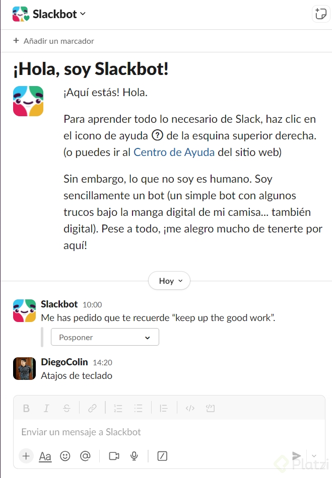 Cuando tengas dudas acerca de los atajos y diferentes aspectos de Slack, no dudes en preguntarle a Slackbot, ya que funciona como una bibliotecaria que recopila la mejor documentación para emplear esta herramienta.