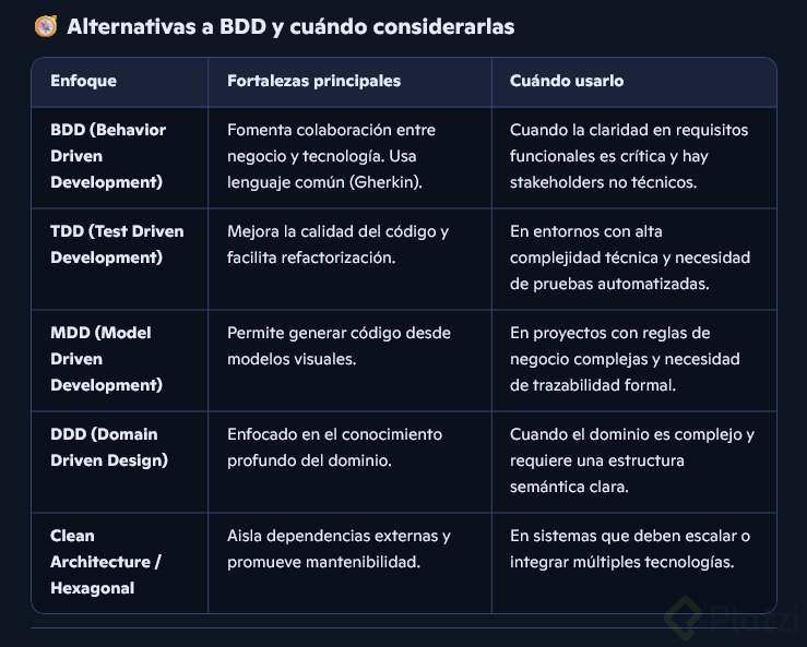 Además de BDD, existen enfoques como model driven development y test driven development, entre otros. Sin embargo, elegir el método adecuado depende de la claridad en la comunicación, la cadencia requerida y la alineación con la estrategia general del proyecto. Evitar prácticas centradas en impresionar a terceros en vez de aportar valor real es esencial.