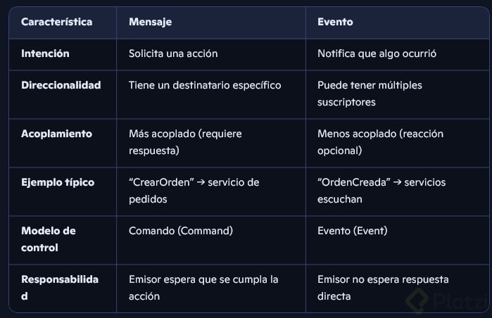 Diferencias entre mensajes y eventos en arquitectura de servicios