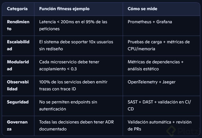 La función fitness es un indicador que muestra si un sistema o arquitectura está avanzando por el camino correcto respecto a sus requisitos. - Permite medir aspectos como seguridad, flexibilidad y adaptabilidad del sistema durante el desarrollo. - Puede incluir medidas tanto cualitativas como cuantitativas. - Ayuda a identificar si la evolución está alineada con la estrategia general del producto.