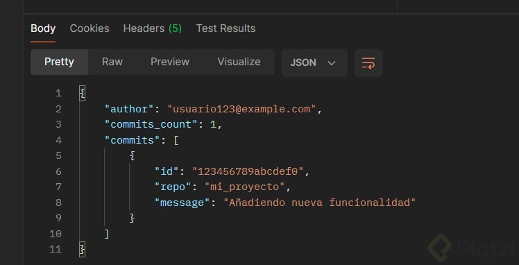 - Enviar la petición y validar el 200 con campos: author (email enviado), count (número de commits), y arreglo commits con id, project y message.