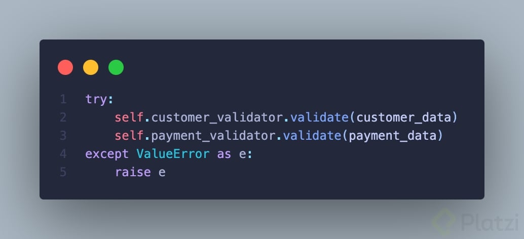 Al igual que en la validación del cliente, se creó una clase PaymentDataValidator, encargada de validar los datos de pago, como la fuente de pago (por ejemplo, si se provee una tarjeta o token válido).
