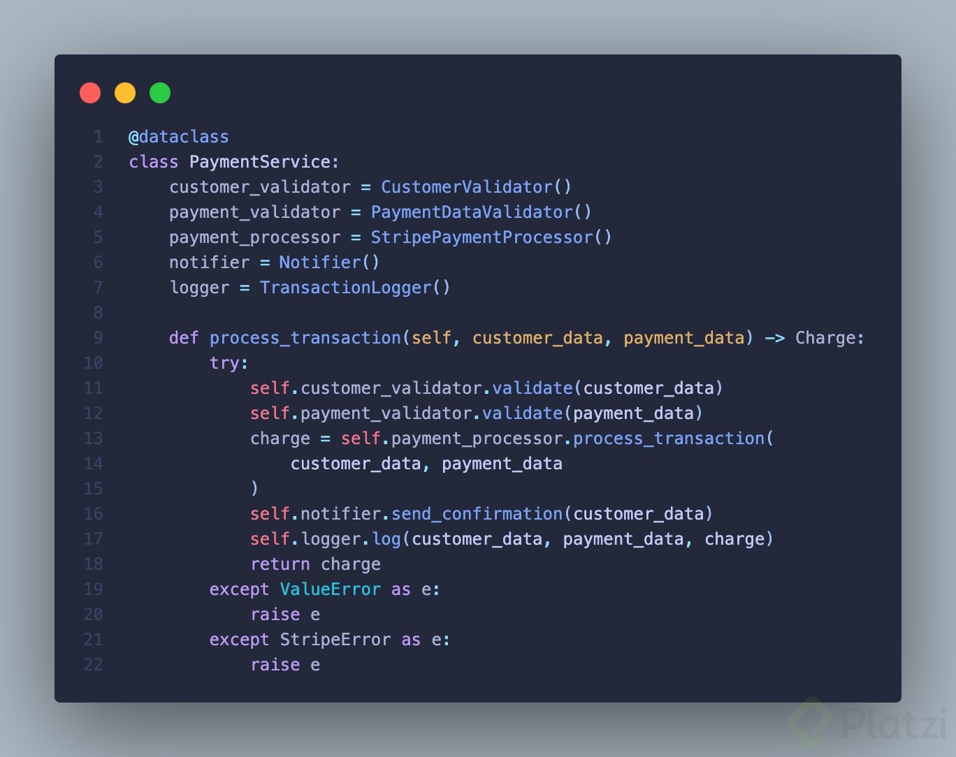 El procesamiento de pago es una responsabilidad que corresponde a la interacción con la API de Stripe. En este caso, se mantuvo esta lógica en una clase llamada StripePaymentProcessor, asegurando que solo procese pagos.