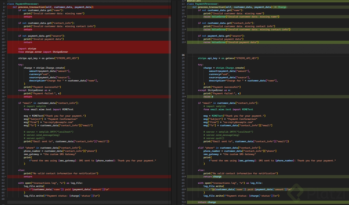 Para aplicar el principio de responsabilidad única (SRP) sobre un procesador de pagos en Python, se debe organizar el código para que cada clase o método tenga una única responsabilidad. A continuación, te explicaré cómo refactorizar el código original, identificando responsabilidades y dividiéndolo en componentes más manejables.