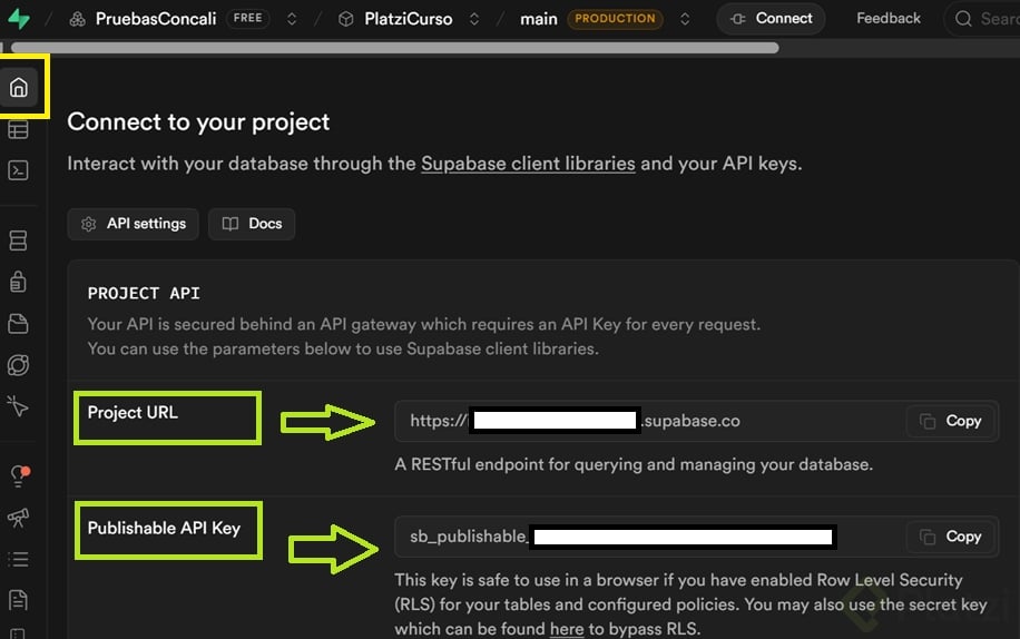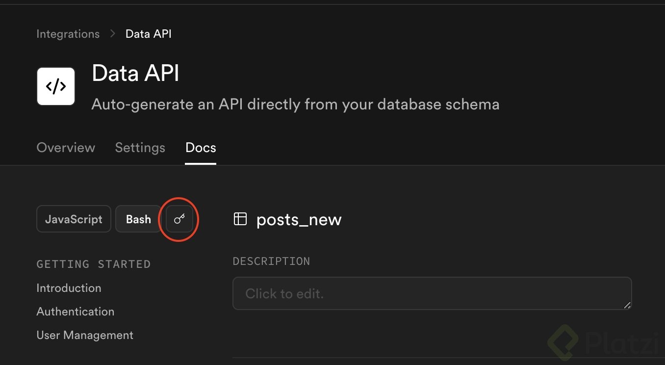 Con datos en Post New, Supabase expone de inmediato APIs funcionales para consumir desde cualquier interfaz usando la URL y la clave pública del proyecto. Todo sin escribir backend: interactúas con la UI, sentencias SQL puntuales y una API preparada para filtrar, ordenar y paginar.