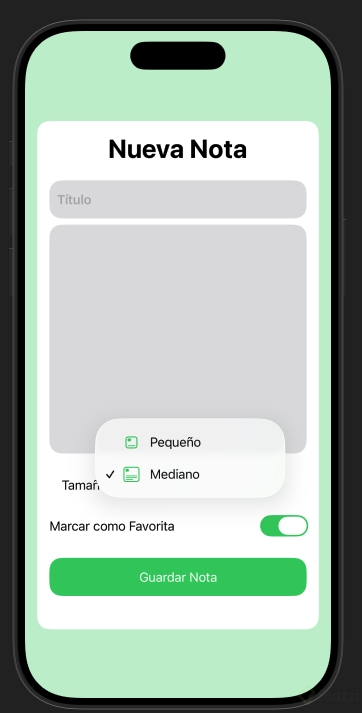Para dar más interactividad a nuestro formulario, introducimos un Picker que permitirá seleccionar el tamaño de la nota, utilizando una interfaz gráfica sencilla combinada con un HStack para incluir etiquetas descriptivas.