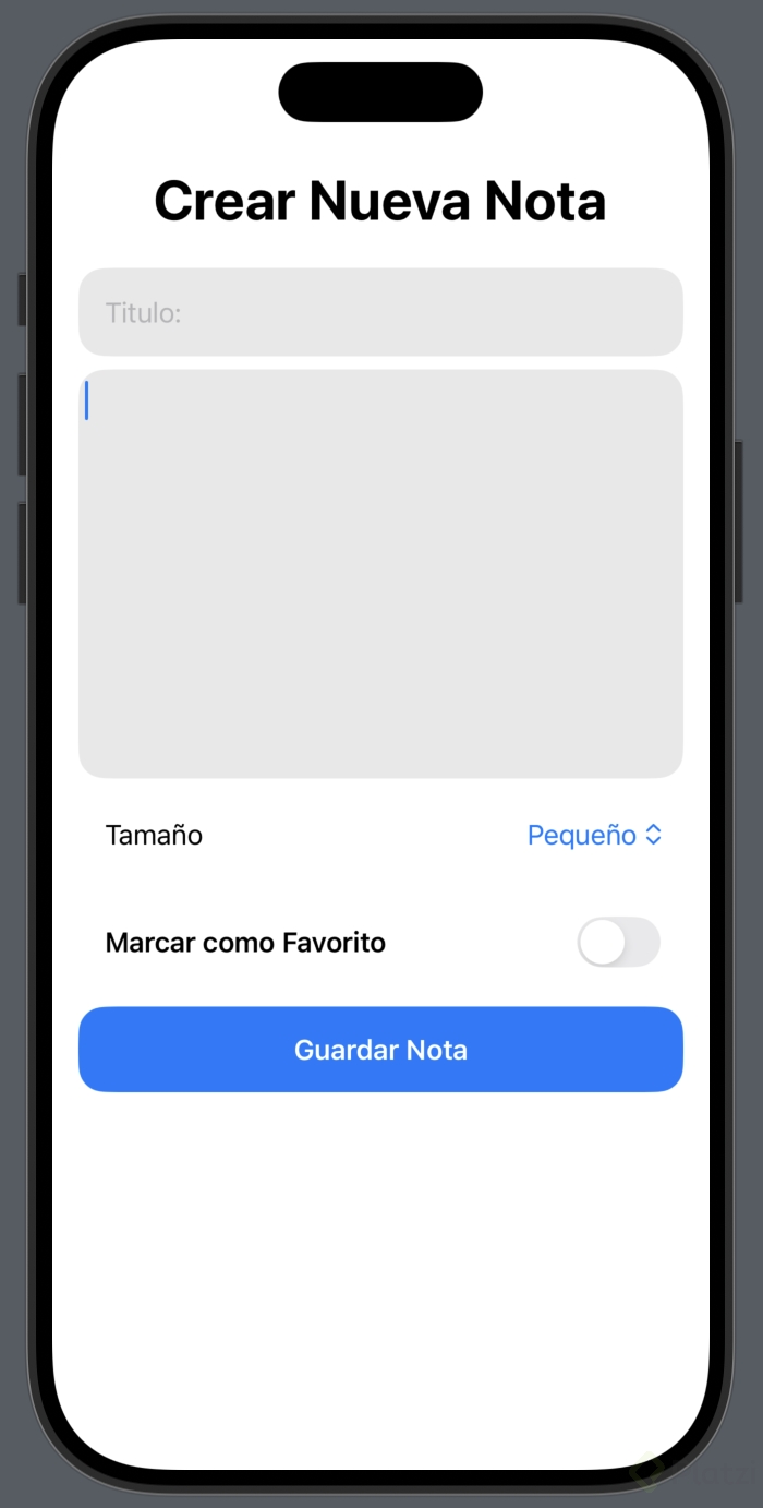 Utilizamos un TextEditor para ofrecer un área amplia donde se puede escribir la descripción o el cuerpo de la nota. Este editor de texto también estará vinculado a una variable @State.