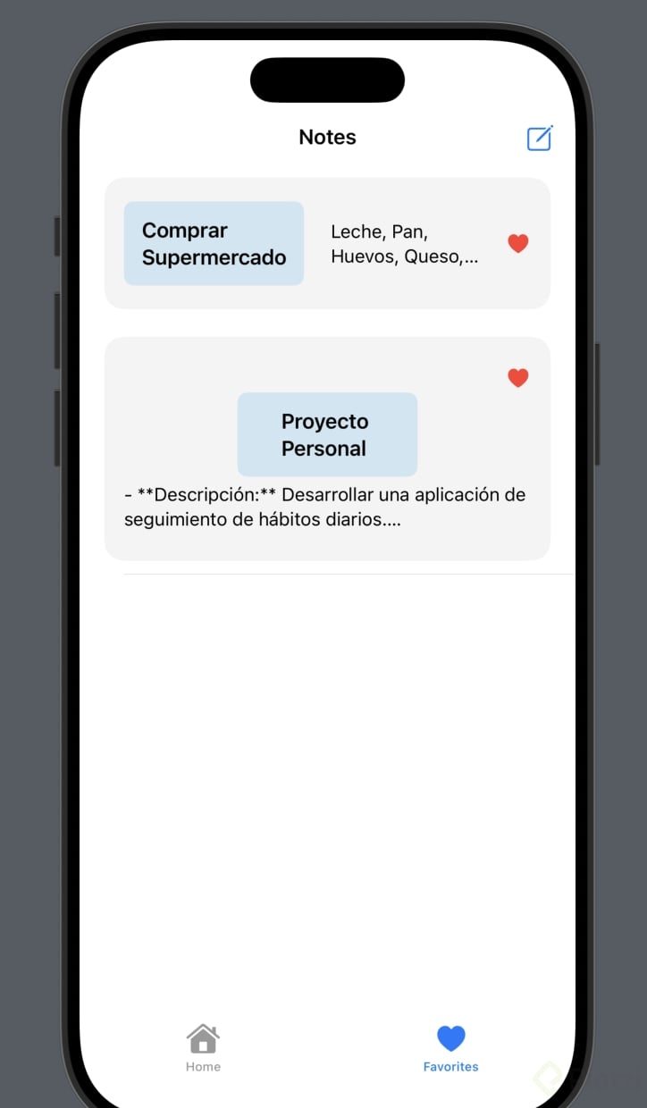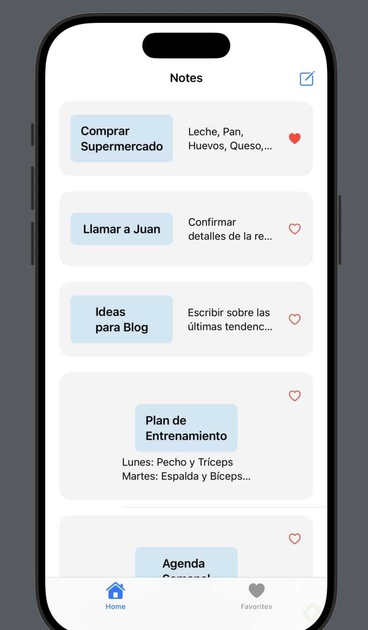 Las TabViews permiten entregar múltiples pantallas organizadas de forma clara y accesible. En el ejemplo a continuación, creamos dos panoramas: una lista de notas y otra de favoritos.