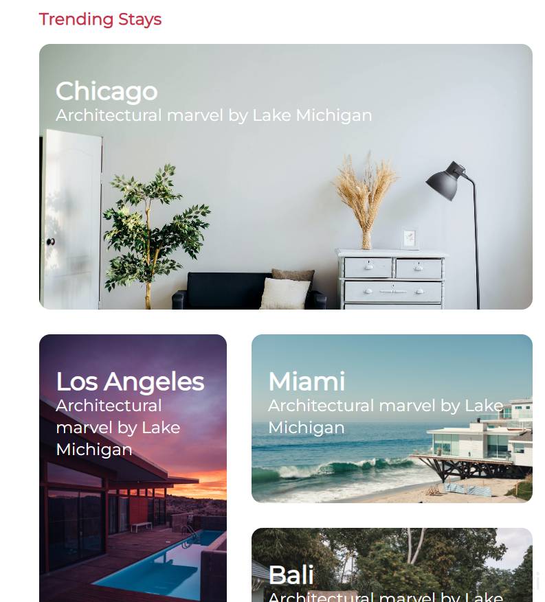 <div class="p-5 grid grid-cols-1 gap-9 justify-items-center md:grid-cols-trending md:grid-rows-trending md:h-screen md:mx-auto"><div class="rounded-2xl w-10/12 h-96 px-6 py-12 text-white bg-cover bg-chicago md:w-full md:h-full md:col-start-1 md:col-end-3"><h2 class="font-bold text-2xl md:text-4xl">Chicago</h3><p class="text-base md:text-2xl">Architectural marvel by LakeMichigan</p></div><div class="rounded-2xl w-10/12 h-96 px-6 py-12 text-white bg-cover bg-LA md:w-full md:h-full md:row-start-2 md:row-end-4"><h2 class="font-bold text-2xl md:text-4xl">LosAngeles</h3><p class="text-base md:text-2xl">Architectural marvel by LakeMichigan</p></div><div class="rounded-2xl w-10/12 h-96 px-6 py-12 text-white bg-cover bg-miami md:w-full md:h-full"><h2 class="font-bold text-2xl md:text-4xl">Miami</h3><p class="text-base md:text-2xl">Architectural marvel by LakeMichigan</p></div><div class="rounded-2xl w-10/12 h-96 px-6 py-12 text-white bg-cover bg-bali md:w-full md:h-full"><h2 class="font-bold text-2xl md:text-4xl">Bali</h3><p class="text-base md:text-2xl">Architectural marvel by LakeMichigan</p></div></div>```Para definir las filas y columnas utilice en el tailwind.config.js lo siguiente dentro de theme.extend: