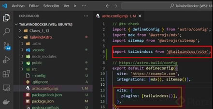 Cuando trabajamos con Astro, encontraremos el archivo de configuración de Tailwind en la raíz de nuestro proyecto, generalmente con el nombre tailwind.config.mjs. Este archivo es generado automáticamente cuando instalamos el soporte para Tailwind CSS en Astro mediante sus plugins oficiales.