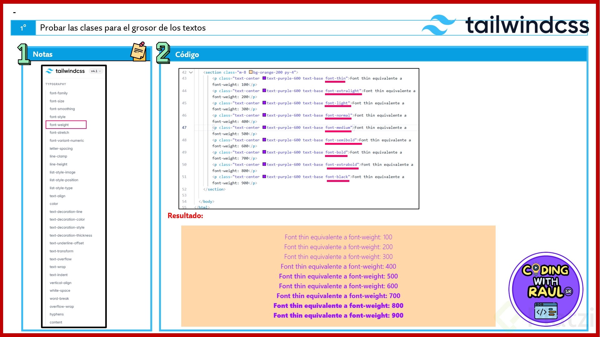 Tailwind también nos permite controlar el grosor de la fuente mediante clases específicas: