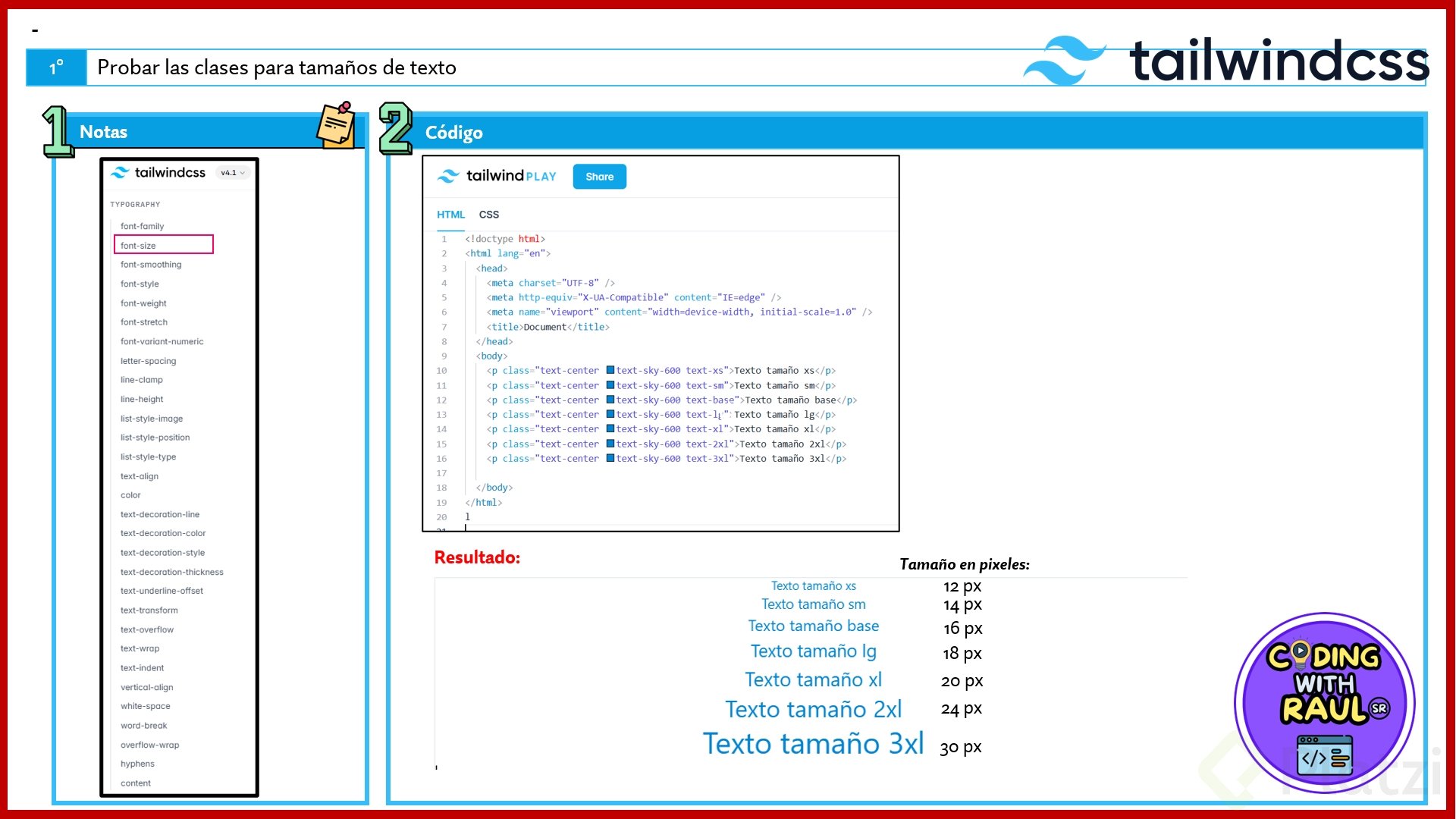 Para modificar el tamaño de la fuente, Tailwind nos ofrece varias clases predefinidas: