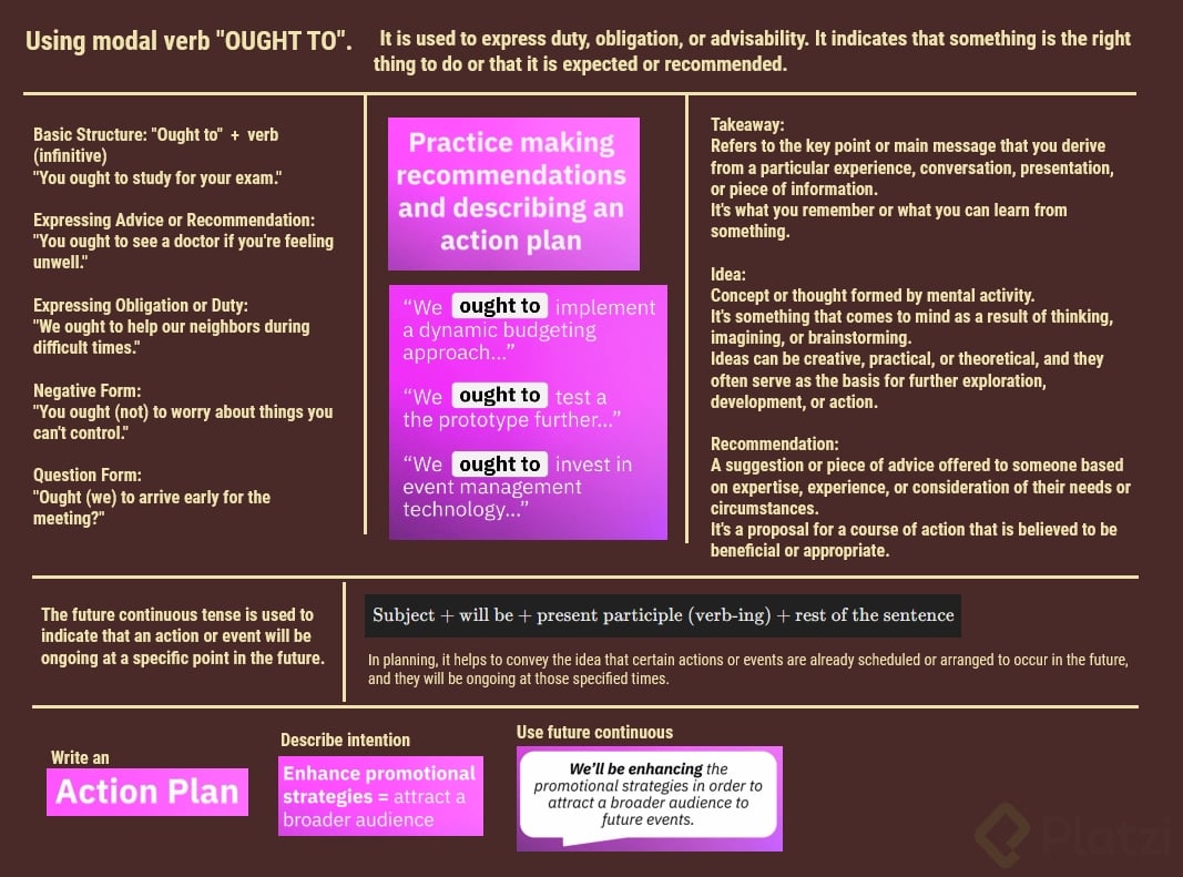 A menudo, después de identificar los aprendizajes y realizar análisis, el siguiente paso es actuar. Las recomendaciones son fundamentales, y saber formularlas correctamente es clave para llevar a cabo acciones exitosas. Por ejemplo, si consideramos que es necesario obtener más información sobre el público objetivo de Cosmo Books, podríamos sugerir la organización de sesiones de grupos focales. Utilizar expresiones como ought to (deberíamos) te permite comunicar estas recomendaciones de manera clara y profesional.