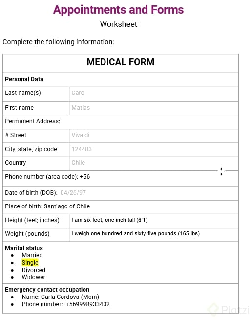 La primera parte de cualquier formulario médico siempre comenzará pidiéndote detalles básicos como tu nombre y dirección. En EE. UU., es común que las personas tengan un solo apellido, por lo que si tienes dos, asegúrate de dejar claro cuál es tu apellido principal para evitar confusiones. También es importante diferenciar entre el code postal y el area code, ya que el primero se refiere a tu dirección y el segundo a tu número de teléfono.