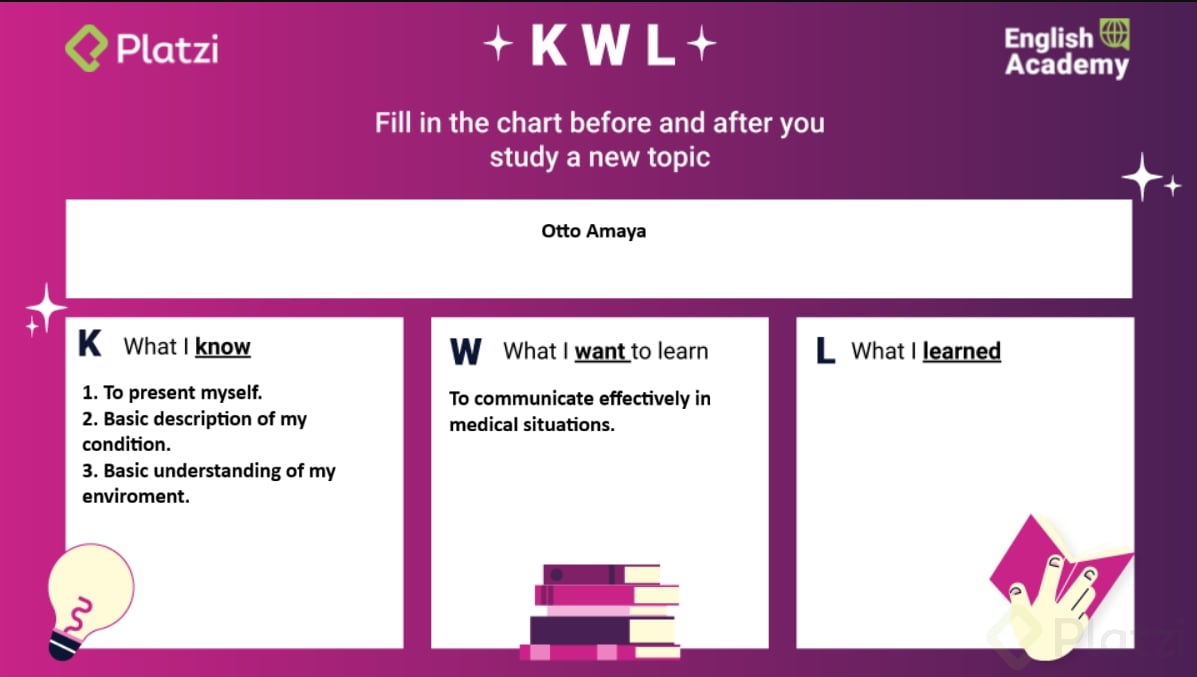 Columna K (Know - Sé): Aquí anotarás lo que ya sabes sobre terminología médica, así como experiencias previas que hayas tenido en situaciones médicas utilizando el inglés.