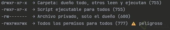 chmod 644 archivo.txt: Usuario lectura/escritura, grupo y otros solo lectura.chmod 700 archivo.sh: Todos los permisos al usuario, ningún permiso para grupo ni otros.