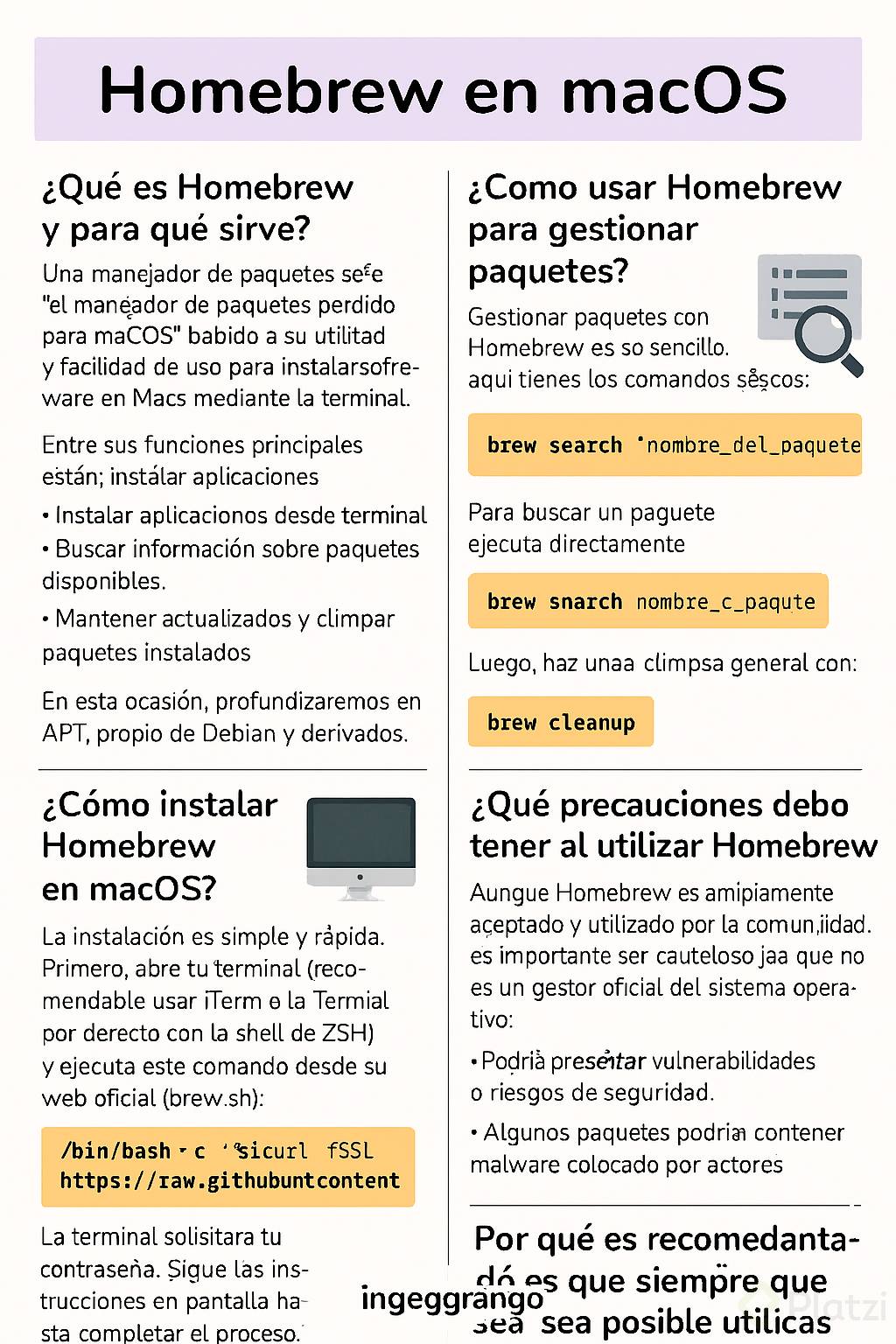 Aunque Homebrew es ampliamente aceptado y utilizado por la comunidad, es importante ser cauteloso ya que no es un gestor oficial del sistema operativo. Esto significa: - Podría presentar vulnerabilidades o riesgos de seguridad. - Algunos paquetes podrían contener malware colocado por actores externos.