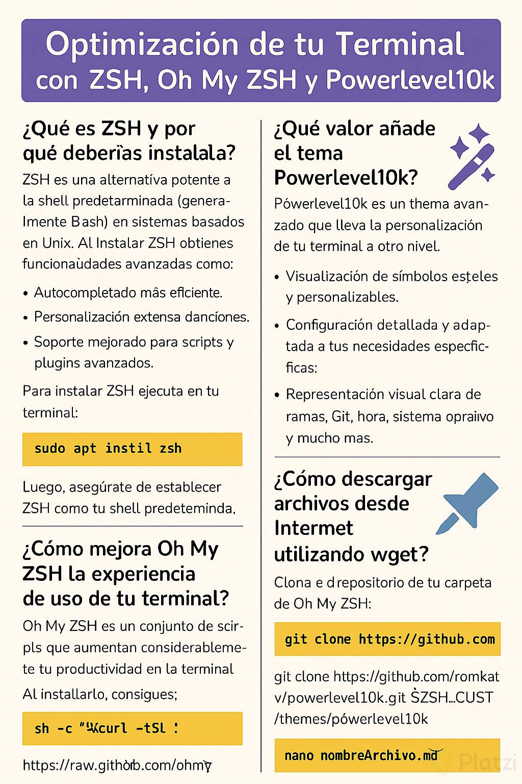 ZSH es una alternativa potente a la shell predeterminada (generalmente Bash) en sistemas basados en Unix. Al instalar ZSH obtienes funcionalidades avanzadas como:
