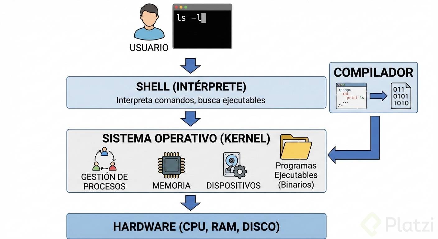 El funcionamiento de una terminal se apoya en un programa llamado shell. Este programa interpreta los comandos que introduces y los traduce en instrucciones que el sistema operativo puede entender y ejecutar. La shell convierte estos comandos escritos en acciones concretas visibles en tu equipo.