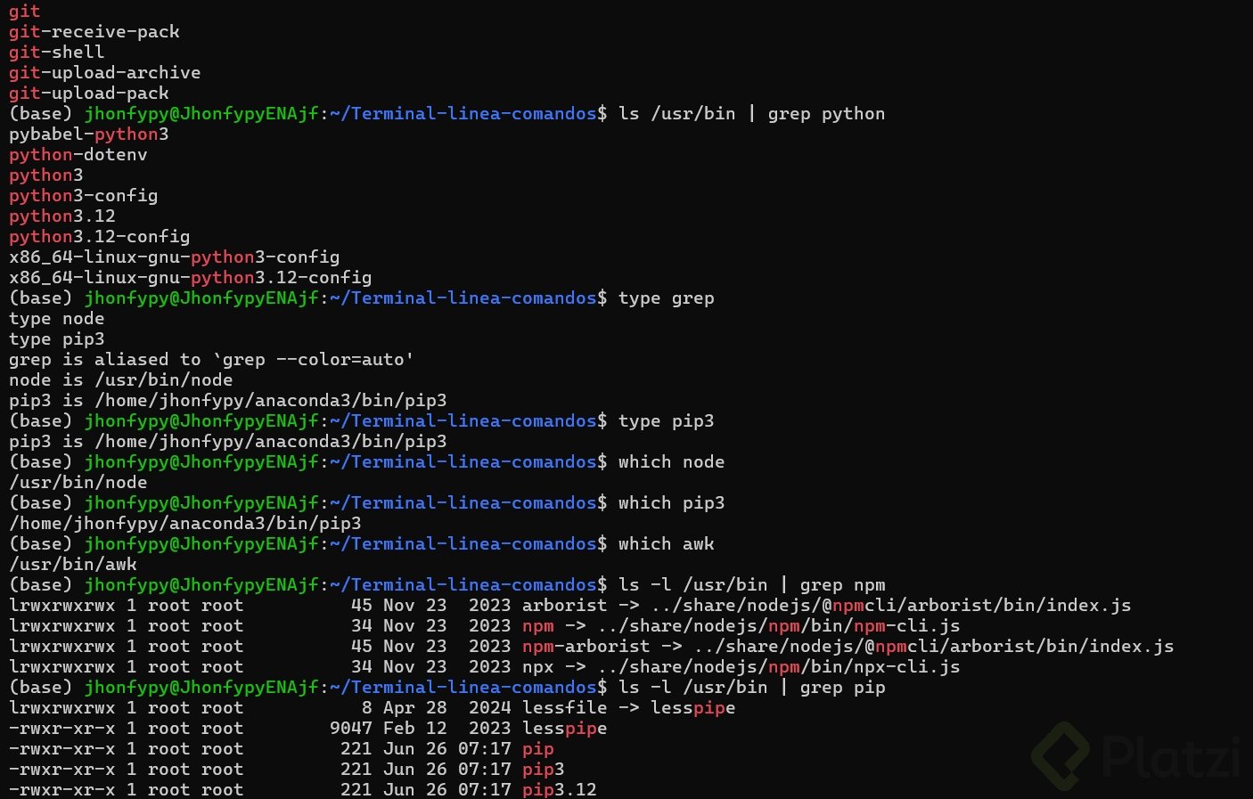 Te recomendamos explorar dentro del directorio /usr/bin, donde se ubica gran parte de los comandos estándares del sistema. Es importante que recuerdes que algunos comandos adicionales pueden provenir de paquetes gestionados mediante npm (JavaScript), paquetes de Python u otros lenguajes que generen binarios globales.